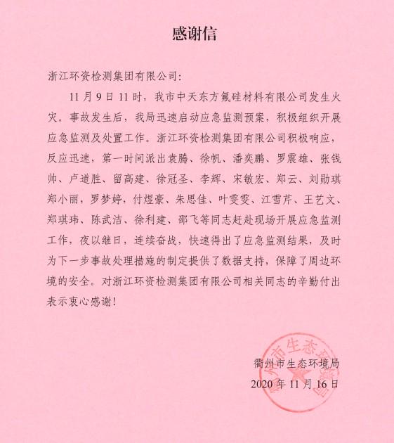 近日,浙江環資檢測集團有限公司收到來自衢州市生態環境局的《感謝信》,感謝環資檢測集團在11月9日本市中天東方氟硅材料有限公司發生火災衢州市生態環境局啟動的應急預案中,積極響應,快速反應,抽派23名精干人員夜以繼日,連續奮戰3天3夜,快速提供應急監測結果,及時為事故處理措施提供數據支持,保障周邊環境安全。對環資檢測集團相關人員辛勤的付出表示衷心感謝!